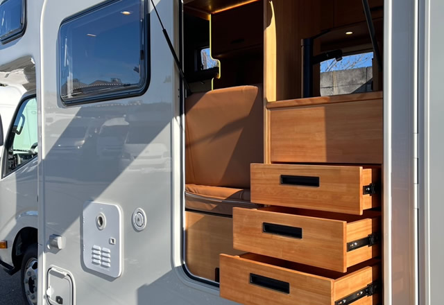 さらにリア側にはプルダウン式ベッドを備え、くつろぎと実用性を兼ね備えた空間を実現しました。