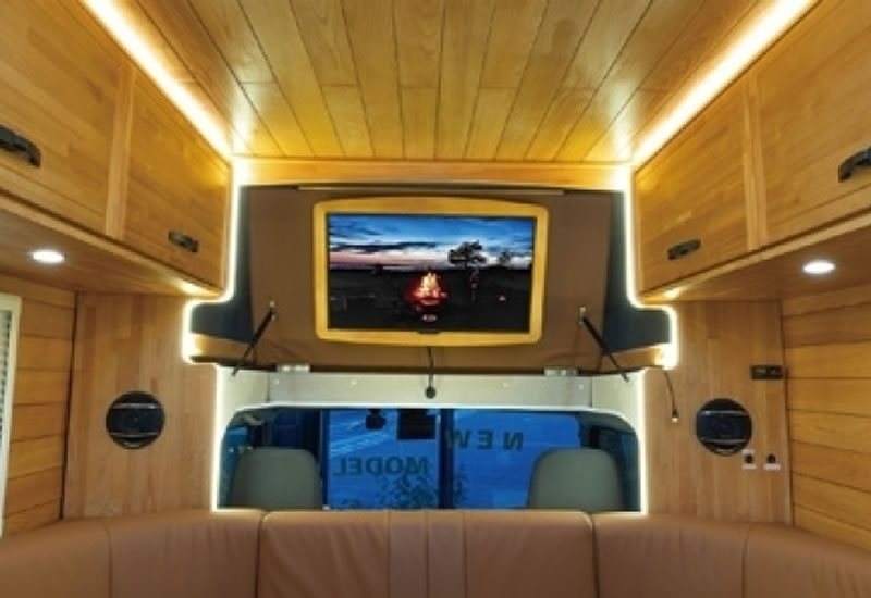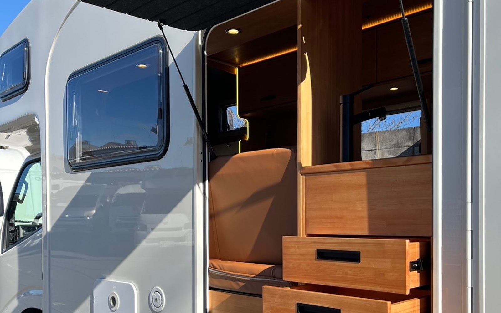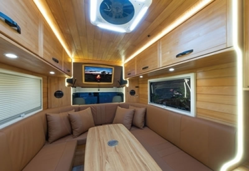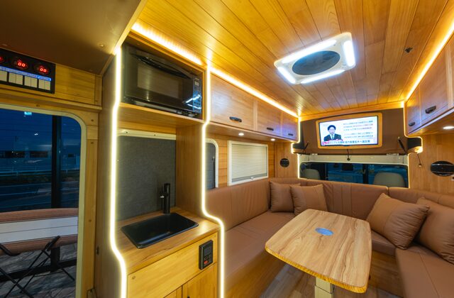 一歩車内に入ると「キャンピングカー」ではなく小さな山小屋・リゾート空間のような感覚になるデザイン設計。